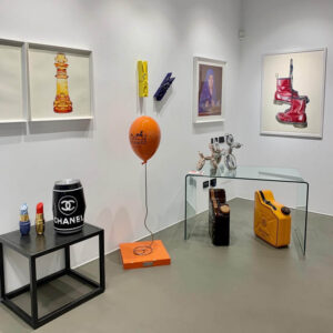 Può una tanica di benzina, simbolo essa stessa di consumo, di sfruttamento delle risorse del pianeta, nobilitarsi ed entrare a corte, corvo con le penne del pavone? Il francese Erik Salin, un passato di Custom Painter per Harley Davidson, stregato dalla Pop Art, è convinto di sì, così la veste con i marchi più famosi della Francia del lusso, da Hermès a Vuitton a Chanel, ma non dimentica brand leggendari del mondo motoristico come Ferrari e Porsche. Dà manforte la moglie Géraldine Morin, creatrice di bigiotteria e di mobili in cartone, nonché scopritrice del talento nascosto del marito, che con i loghi del lusso adorna palloncini, shopper delle più lussuose case di moda – perfette per essere abbandonate con nonchalance in un salotto chic – o icone disneyane, e accosta Topolino a Marilyn Monroe, Brigitte Bardot, Charlie