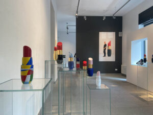 In questa spirale di forme, colori, ossessioni e rimandi, compaiono anche riproduzioni degli iconici e coloratissimi “Balloon Dog”, sculture a forma di cane palloncino del celebre Jeff Koons.