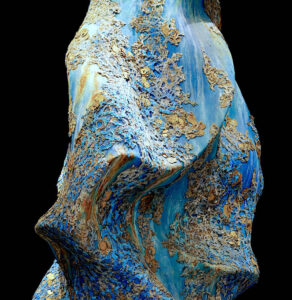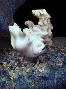 Il percorso della mostra presenta 20 opere tra sculture e tele estroflesse che raccontano di un mondo puro e incontaminato. Accanto a otto pesci in ceramica smaltata e a due in marmo bianco statuario sono esposte per la prima volta dieci inedite estroflessioni create dall’artista con una tecnica sperimentale che ne mette in evidenza la tridimensionalità.