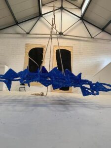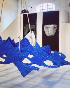 Sospesa a mezz’aria e sorretta dall’imponenza di più funi, l’opera materica di Madhu Das nato in India nel 1987, porta a rimandi acquei, del resto si è a un passo dalla laguna, e allo stesso tempo manifesta una doppia appartenenza sia risalente ad un reperto archeologico, sia ad un frammento proveniente dagli abissi dello spazio.