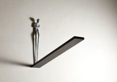 Un'opera di Alex PinnaCi osservano in silenzio, le creature antropomorfe create da Alex Pinna, dall'alto di trampolini dai quali i loro sottili arti inferiori pendono nel vuoto. Quel loro silenzio diviene più intenso a fronte delle ombre presenti sul muro della galleria: silenzio nel silenzio. Quei personaggi paiono racchiudere nelle loro fisionomie, l'essenza di un'ingenua moralità infantile, inattaccabile e pura, forse un po' spaesati nel cercare una giusta dimensione nelle due tele dove affrontano la percorrenza di un piano inclinato o come il Piccolo Principe sostano stupefatte dall'ambiente che li circonda.