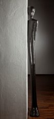 Poco discosta, ad altezza naturale, una sagoma in bronzo simile alle precedenti appoggiata alla parete con il volto rivolto a essa esprime tenera timidezza, forse perchè indotta a confrontarsi con un mondo non suo, con un'altra umanità, forse non ancora in grado di accoglierlo senza pregiudizi.
