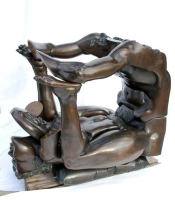 'Maison', 1976Arte e vita realisticamente vissute – E' quando si parla di amore e di morte, sia che vengano tradotti nella plastica sia che vengano interpretati in forma disegnativa o pittorica, che si sprigiona il vero talento e l'anima dell'artista. La cruda realtà di due mani che estraggono il corpo di un nascituro dal ventre di una donna mettono il fatto nudo e crudo davanti agli occhi dell'osservatore, e rivelano al contempo l'interesse dell'artista per l'inizio di una vita nuova che scaturisce dall'atto amoroso, dal concepimento. Come fortemente reale e privo di edulcorazioni appare il tema della morte in "Scena comica della vita moderna", scultura che accoglie il visitatore nell'atrio del Palazzo. Rappresenta un uomo, lo stesso Ipoustéguy, le cui carni deflagrano, disfacendosi, alla notizia della morte della figlia di soli dieci anni appresa al telefono che è fisicamente presente nella composizione a sottolineare la veridicità e la brutalità del fatto accaduto e purtroppo vissuto. La morte viene accolta anche nella serie di tele che raccontano la scomparsa di Papa Giovanni XXIII, dove la nuda verità, il sentimento vivo e personale, il tono clamoroso, ma mai teatrale e simbolico, raccontano del disfacimento progressivo del corpo, del suo inevitabile annichilimento. Una presa di posizione consapevole, quella di Ipoustéguy che non rinuncia a vedere e a vivere la vita positivamente, come traspare dalla scultura che raffigura un soldato ferito, poi risanato, e come non rinuncia alla rappresentazione della parte sessuale dell'atto amoroso, quale aspetto inevitabile dell'eros, creatore di uno spazio di coppia e di un'intimità connaturati all'essere uomo.