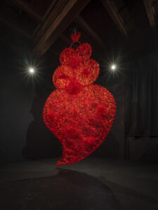Tra le opere più iconiche in mostra, il cuore rotante Red Independent Heart (2013) omaggia il Fado e il simbolo sacro di Viana, mentre Flowers of My Desire – che dà il titolo alla rassegna – esprime il contrasto tra desiderio e minaccia con piumini e spuntoni metallici. In Vista Interior (2000), l’artista riempie una vetrina di oggetti datati trasformandola in una Wunderkammer del quotidiano.