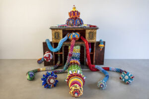 L’esposizione si snoda su due piani in un percorso coinvolgente che intreccia scultura, installazione, arte tessile e design in una riflessione potente su identità, genere, consumismo e memoria.