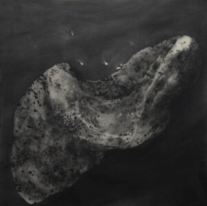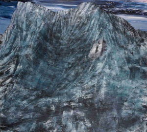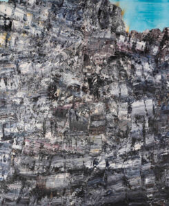 La serie The Same Sky è il frutto di una ricerca sulle formazioni geologiche delle regioni Dinariche e del Prokletije che l’artista approfondisce dopo l’esperienza del terremoto di magnitudo 5.5 che il 22 marzo 2020 aveva causato enormi danni anche a Zagabria e il cui epicentro era stato individuato a nove chilometri di profondità. Un evento che ha messo sotto la lente di ingrandimento la potenza e fragilità delle montagne, in contrasto solo apparente con la loro maestosità. Il mondo minerale a cui esse appartengono è definito inanimato, ma solo se lo si guarda in superficie, perché nelle viscere della terra gli elementi minerali vivono un dinamismo potente e imprevedibile. La natura idilliaca non è il centro di interesse di queste opere, che anzi diventano l’occasione per una riflessione di politica ambientale e ricerca sociale e culturale, riflesso delle storie e dei traumi personali o collettivi. I suoi paesaggi maestosi sono anche il riflesso del bisogno vitale dell’uomo contemporaneo di pace e profonda meditazione. In questa serie monumentale Katarina sperimenta per la prima volta la spiccata materialità e il potenziale tattile della pittura, avvicinando la superficie del dipinto alla struttura dei massicci di pietra.