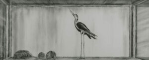 Al Museo di Storia Naturale sono esposte cinque opere realizzate con la tecnica del carboncino su carta che raffigurano i diorami conservati nel Museo di Storia Naturale di Dubrovnik – dove l’artista ha lavorato nella sezione di didattica museale dal 2009 al 2014 – che, inaugurato nel 1872, ha la stessa impostazione ottocentesca del museo milanese fondato nel 1838. Nel magazzino del museo, Katarina scopre vecchi diorami preparati con uccelli, conservati sotto teli di plastica trasparente, coperti per proteggerli dalla polvere e per rallentare il naturale processo di decadimento; nello stesso periodo scopre fotografie in bianco e nero di questi stessi diorami, vecchie di almeno cinque decenni, realizzate come documentazione museale. Tutto questo materiale entra nella sua ricerca approfondita e studiata attraverso il disegno e la fotografia, il cui esito è il libro De Materia Avium. Solo apparentemente le montagne sono lontane dalla vitalità degli uccelli che volano e si librano leggere nell’aria, cantando. Tuttavia gli uccelli riprodotti in questa serie diventano