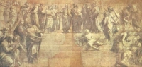 Il cartone di RaffaelloUn capolavoro anticipa l'altro – Uno dei capolavori assoluti della Pinacoteca Ambrosiana è senz'altro il grande "cartone" preparatorio di Raffaello per la l'affresco della Scuola di Atene in Vaticano. Fu realizzato dal grande maestro Urbinate nel 1510 ed entrò all'Ambrosiana grazie al mecenatismo del cardinal Federico Borromeo nel 1610: è giusto dunque celebrare congiuntamente il quinto e il quarto centenario