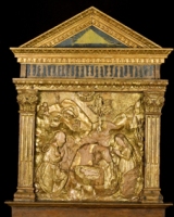 Anconetta restaurata1900 – 'Bassorilievo dorato e dipinto rappresentante il Presepio. Lavoro della fine del secolo XV, colla cornice in parte rifatta. Dono del Prof. Lodovico Pogliaghi', così viene descritta l'anconetta quattrocentesca, nel primo catalogo del Museo del Santuario del 1905. In questo luogo, che già ad inizio secolo rappresentava un vanto per il colle sacro sopra Varese, era custodito il dono di Ludovico Pogliaghi. Lì trova sede fino agli inizi degli anni '30 quando il progetto e l'allestimento per il Museo Baroffio furono portati a termine per ricevere il patrimonio artistico del Santuario, anconetta compresa. Che oggi torna a mostrarsi al pubblico dopo i restauri, e dopo essere stata ricollocata al Museo, dopo una lunga permanzenza più che ventennale nella casa parrocchiale di Santa Maria del Monte, nell'appartamento del compianto Mons. Pasquale Macchi.