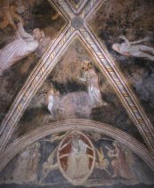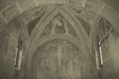 L'interno. All'interno il panorama cambia, dando la sensazione di essere trasportati in un altro mondo: l'aula è coperta da graziose volte a crociera e da una volta a botte nella campata antistante il presbiterio; è dotata di una piccola abside piana, ma soprattutto è interamente affrescata con pregevoli dipinti della seconda metà del Trecento, che nella loro raffinatezza e ricchezza fanno contrasto con il tono semplice e privo di pretese dell'esterno. La parete di fondo del presbiterio è occupata dalla grande Crocifissione, affiancata dalle figure dei Santi Ambrogio e Caterina. Il programma iconografico degli affreschi contiene un sottile significato mariologico, secondo il quale viene sottolineato il ruolo di Maria come nuova Eva e la redenzione del peccato dei progenitori attraverso il concepimento virginale di Maria e il sacrificio di Cristo sulla croce.