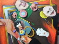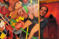 L'artista nel suo studio (ph. Giorgio Lotti)Sfondano le pareti – Un ambiente intimo e accogliente quello della Galleria Vinciana di Milano, uno spazio che nel tempo ha saputo accogliere e presentare al pubblico le diverse fasi espressive di Luca Lischetti. Le pareti bianche vengono questa volta letteralmente sfondate dai nuovi mondi creati dall'artista, nuove scene e nuove quinte teatrali, nuove dimensioni e prospettive. Buz Baz, i teatrini, vivaci, caotici, movimentati, colorati, inondano lo spazio facendo perdere all'osservatore lo spessore della parete, entrando e uscendo l'opera in continuo da questa.