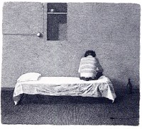 Giovane seduto sulla branda, 1981Nei raccolti e limpidi spazi della Bambaia saranno visibili una trentina di lavori su carta, tra matite, litografie e acqueforti. Nell'arte incisoria Ferroni diede il meglio di sè, coniugando tecnica sopraffina e soggetti tanto disadorni quanto ricchi di una laica trascendenza.