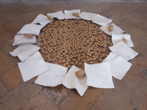 La “Danza primitiva” (2015) di Annalisa Mitrano rimanda agli albori del mondo, composta da terra semirefrattaria bianca, argilla rossa comune e plexiglass, fissa nel suo essere l’idea di perfetta circolarità,