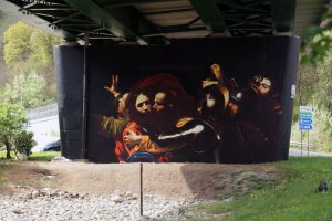 Poi, nel 2016 rimetto insieme questi due tasselli: il mondo delle bombolette spray che avevo parzialmente abbandonato e il mondo della pittura che avevo affrontato durante l’Accademia e così nasce il progetto del recupero del classicismo nel contemporaneo con la realizzazione del primo muro “La Cattura di Cristo” alla rotonda dell’Iper. Porto avanti la tradizione della copia, traduco questi grandi del passato – con formati e media completamente differenti- li riporto sulla strada, accendo i riflettori sull’arte antica e la metto in correlazione col territorio e affronto anche la questione dell’educazione facendo lezioni in strada alle scuole. Il momento di svolta mediatico è proprio l’ aprile 2016 quando, dopo comunque quindici anni di lavoro, i riflettori si accendono su di me e spero rimarranno accesi per tanto. Questa mia traduzione della copia è inedita: a livello di tecnica sono i primo che ha approcciato in questa maniera. Tanti si sono ispirati al classico ma nessuno a queste grandezze ci ha mai pensato. Io sono arrivato alla sintesi per cui la traduzione e la copia hanno più potenza e impatto dell’interpretazione: per me è più contemporaneo questo metodo.