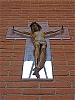 casuale replica. Al suo interno, per ora unico segno degno di nota, la popolare ma espressiva figura lignea di un Cristo antico crocifissa ad una croce di plexiglas trasparente come se fosse una… vetrofania; così come non v'è traccia iconografica della dedicatoria ad Elisabetta ( che porta in grembo il Battista, il precursore del Cristo) visitata da Maria (tedofora ): auspichiamo che un simile evangelio venga affidato alle cure di un artista di comprovata sensibilità non iconolatra per il sacro.