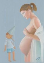 Corpi che generano corpi – "Nei lavori di De Blasi c'è un plasmare corpi in forma evocativa dello spirito che emanano sentimenti legati alla sacralità della donna nella sua energica bellezza. Donne che guardano il proprio grembo nella più assoluta quiete, nella naturalezza di condividere un corpo che genera altri corpi che si legano ad elementi di immaginazione e di sogno come la cicogna simbolo di pietà filiale, elegante volatile che si crede "portatore di bambini", probabilmente in rapporto ai suoi costumi di uccello migratore , il cui ritorno corrisponde al risveglio della natura". Così Giuseppe Cinquegrana ha commentato il lavoro di De Blasi, che sembra richiamare la celebre "Lettera a un bambino mai nato" della Fallaci.