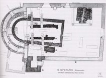 Una piccola chiesa dedicata a S. Stefano – Probabilmente a partire dal VII secolo, in piena età longobarda, sul presunto sacello sorse la primissima chiesa, più piccola dell'attuale e caratterizzata da un'abside minore, messa in luce durante gli scavi. In epoca romanica l'edificio assunse la forma attuale, ad una navata chiusa da un'abside, probabilmente in seguito ad un incremento demografico verificatosi dopo il X secolo. Proprio a questo periodo risale un primo ciclo di affreschi dell'abside, di cui oggi rimangono solo alcune tracce, perché gli interventi architettonici dei secoli ne hanno provocato la distruzione. Si può però tentare di ricostruire l'antico apparato decorativo: una parte inferiore, decorata a losanghe, ed una superiore, con figure umane, fra cui, molto delicata, quella di un giovane santo. A questo periodo risalgono anche altre otto tombe, di cui una femminile, orientate verso l'altare.