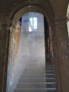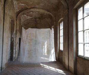 Il silenzio e la sospensione temporale che percorre saloni, scalinate e androni, risulta ideale scenario alla trasparenza dei veli presenti nei luoghi di confine tra i distinti spazi, quasi intendessero assumere la funzione di araldo della soglia. La loro fluttuante trasparenza, come in un sogno sospeso, pare definire il soffio di un impalpabile respiro. Quali filtri di