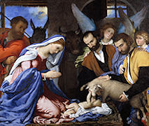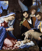 Un particolare della tela164 cm) suggeriscono che la tela fosse destinata alla parete di un palazzo privato. È peraltro molto probabile che i volti dei due pastori siano i ritratti dei committenti, verosimilmente due fratelli, come suggerisce il loro particolare abbigliamento. Infatti, sotto le giubbe da pastori, si scorgono abiti eleganti che rivelano una condizione sociale decisamente elevata. Il capolavoro costituisce indubbiamente un punto nodale nel percorso del Lotto, che trasforma il tema della "Sacra Conversazione dei veneti in una riunione confidenziale che accomuni sullo stesso terreno e distribuisca la stessa indole ai personaggi divini e umani" (R. Longhi). Nel catalogo, che accoglie anche contributi di Alessia Devitini, Francesco Frangi, Elena Lucchesi Ragni, Roberta D'Adda, Simone Regazzoni, Guido Malzani e Nadia Righi, sono illustrati tutti i confronti con opere pittoriche e grafiche come l'Adorazione dei pastori di Jeremias Falck (Metropolitan Museum di New York), o l'Adorazione dei pastori di Vincenzo Catena (Metropolitan Museum di New York) o ancora l'affresco con la Natività e i Santi Rocco e Sebastiano di Credaro (Bergamo), sempre dipinta dal Lotto, vero "genio inquieto del Rinascimento".