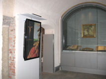 Allestimento con flat screenpresentato l'esposizione sottolineando come "anche il Comune di Milano ha intrapreso, con gran successo, l'iniziativa di portare in mostra una sola opera – come nel caso del crocifisso attribuito a Michelangelo giovane – iniziative che consentono una maggiore concentrazione e comprensione del singolo bene culturale. Il Museo Diocesano è giunto alla settima edizione di "Un Capolavoro per Milano". È evidente che in questo ambiente, la scelta di questo straordinario dipinto trova un'esplicita consonanza con il resto della collezione esposta permanentemente, rispondendo pienamente alla vocazione dell'istituzione museale ed inserendosi appieno nel solco della sua storia". Né possiamo dimenticare che nelle prime sei edizioni di "Un Capolavoro per Milano", i visitatori sono stati oltre 230.000.