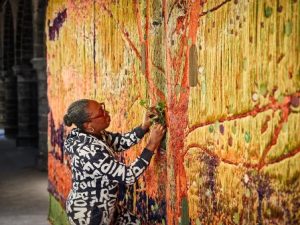 Negli oltre 2500 metri quadrati disponibili, l’artista nigeriana ha dato vita a opere realizzate con uso di materie prime quale simbolo della sua terra natale, sviluppando inoltre un ideale dialogo con i lavori di Hans Memling e Jean Beerblock provenienti dalla collezione del Museo di Bruges.