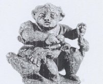 statua di fanciullo in ambrastatuetta in ambra che raffigura un bimbo grassoccio dai grossi occhi, vestito di una corta tunica, rappresentato accovacciato, mentre gioca con un volatile.