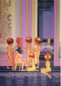 Nei 60 disegni in mostra eseguiti per quella rivista patinata che negli anni ’60 e ’70 superò la fama di Playboy sfiorando il mezzo milione di copie vendute mensilmente, raffigurano uno spaccato femminile di dame altezzosamente a loro agio in qualsivoglia situazione e ambiente, dai grandi ricevimenti, al privato più intimo.