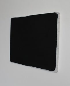 Nell’opera di Luca Scarabelli il perimetro della superficie piana, delineato da una frastagliata percorrenza bianca, tende a limitare l’immanenza dell’area nera che la pervade quasi per intero, conferendo all’insieme l’essenzialità dell’equilibrio.