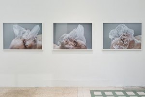 La sequenza di foto esposte mostra come l’artista avvolgendo il volto da maschere realizzate con plastica trasparente termoformata, moduli il respiro in modo da creare spazialità immaginarie dall’intenso valore visionario e simbolico arrivando a idealizzare mondi fiabeschi e leggendari sino a distanziarsi dalla logica rassicurante della precisione.