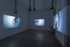 Di rimando alle immagini fotografiche, una installazione a quattro canali definisce l’animazione dell’atto respiratorio – creativo con distinti moduli temporali a loro volta sorretti dalla purezza di sfondi atti a svelare le vibrazioni di più mondi interiori, quasi fossero le varie forme dell’anima.