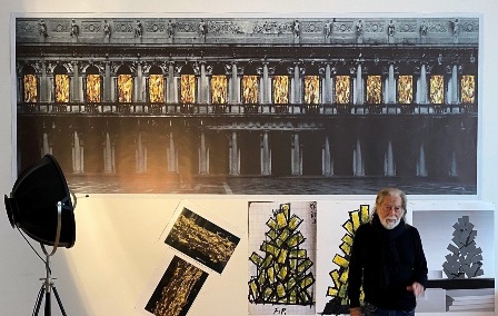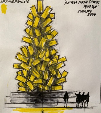 Venezia – Il silente e suggestivo scorrere dei flussi dorati all’interno delle imponenti vetrate dell’Ala Napoleonica del Museo Correr ,dove l’installazione di Fabrizio Plessi “L’Età dell’oro” modula con calibrate cadenze la scritta “Pax Tibi”, pare stabilire un ideale dialogo con il luminoso Albero della vita ideato dal Maestro, collocato tra le due colonne, quale ideale sipario, della piazzetta di San Marco; progetto promosso dal Comune di Venezia e Vela Spa con la partnership di Assicurazioni generali nell’ambito della rassegna “Città in festa – Natale 2020”.