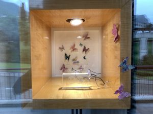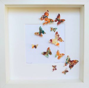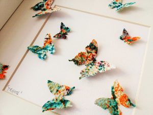 Le “farfalle” sono racchiuse in cornici profonde 4 centimetri e mezzo per creare la tridimensionalità e sono piegate in modo che sembra che stiano spiccando il volo. Altrimenti sono posate su rami e spesso danno l’impressione che siano vere.