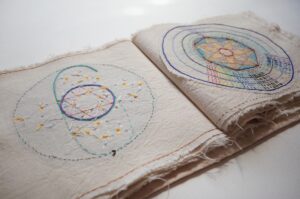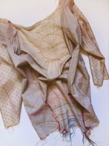 Una delle fonti di ispirazione più ricorrenti per Giuseppina è il semamori, un antico tipo di ricamo giapponese praticato principalmente durante il periodo Edo. Questo ricamo, con funzione apotropaica, è un esempio di come l’arte del cucito possa assumere significati profondi e spirituali. Le madri giapponesi, ricamando queste cuciture sul retro dei kimono dei loro bambini, non solo li proteggevano, ma creavano un legame culturale e simbolico con le nuove generazioni. Giuseppina si è lasciata affascinare da questa tradizione, riconoscendo in essa la forza magica del cucito, un atto che diventa un talismano e un mezzo di connessione con il Sacro.