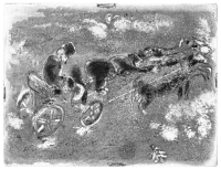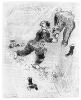 Un'incisione di ChagallVisionarietà – Le anime morte di Gogol invece aderivano perfettamente alla sensibilità di Chagall. L'atmosfera russa, il paesaggio russo, il nomadismo fisico e spirituale dei personaggi, già intriso di quella specifica visionarietà religiosa che toccano altri vertici della sua produzione pittorica e grafica. Quegli stessi, del resto, tra i Venti e i Trenta, sono gli anni in cui il lavoro grafico assume un ruolo e una dimensione preponderante nella sua attività, culminata più tardi con il progetto legato alla Bibbia. Il lavoro per Le anime morte, cominciato con le prime lastre nel 1924, si conclude di fatto nel 1927 con la stampa presso la calcografia Fort, pur vedendo editorialmente la luce solo nel 1948, ben oltre la morte di Voillard.