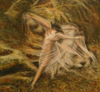 Opera di Luciana SpeltaMano a mano che Luciana scopre questa sua voglia di liberarsi ed evadere dalle catene ormai strette della realtà il movimento, avvertito nei cieli e negli sfondi dei lavori precedenti, si espande poco a poco alla preparazione della tela stessa e ai soggetti. Nasce così una pittura materica, in cui il movimento è ricercato non solo dalla pennellata ma dalla matericità densa e spessa del colore, che vibra insieme alle donne che danzano e si liberano da quei lacci che immaginiamo le tenevano legate e appesantite.