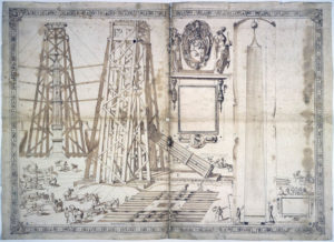 Infine, la terza sezione (Saperi tecnici) è dedicata alla celebre impresa del trasporto e dell’innalzamento dell’obelisco Vaticano, degli altri obelischi di Roma e alla meno eclatante (ma di «non piccola difficultà», come ebbe a scrivere lo stesso Fontana) traslazione della medievale cappella del Presepe all’interno della cappella Sistina in Santa Maria Maggiore. Una speciale attenzione viene rivolta alla “officina del trattato”, vale a dire l’articolato processo di elaborazione e pubblicazione del volume di Domenico Fontana, Della Trasportatione dell’obelisco Vaticano, il cui Libro primo uscì a Roma nel 1590, seguito da un Libro secondo dato alle stampe a Napoli nel 1604. Particolarmente rilevanti sono due disegni preparatori di Giovanni Guerra per le incisioni di Natale Bonifacio (provenienti dagli Uffizi e dalle Beaux-Arts de Paris) come pure il fascicolo, conservato a Roma presso la Biblioteca Angelica, che raccoglie le bozze di gran parte delle tavole del Libro primo, corredate al margine dalle osservazioni manoscritte dell’Agostiniano Angelo Rocca, illustre filologo e teologo, sovrintendente della Tipografia Apostolica Vaticana fondata da Sisto V.