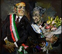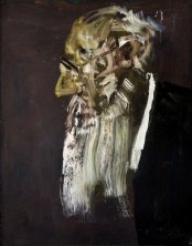 Gli stessi volti, ma smascherati, che il pittore ha sempre prediletto. Quelli che declinano, con pietosa oggettività, un male dell'anima che fa perdersi in sé, quelli sguaiati di un ridere dislessico, sinistro e indecifrabile che mette le ali della follia, quelli remissive e dimentichi, che guardano senza guardare, annientandosi in una maschera rinsecchita di inconsapevolezza, quelli di chi manifesta il proprio limite oltre quello dei normali comportamenti, quasi fosse un genio stupido o uno stupido geniale.