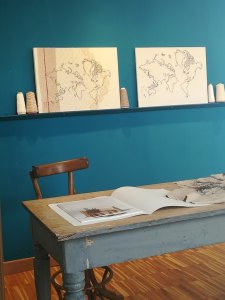 La mostra dal titolo Ethos e Mappature: entro ed oltre il confine raccoglie tre Mappe cucite su tessuti, tra cui ad esempio una camicia. Cosa rappresentano i tessuti per l’artista saronnese? Sono i testimoni degli incontri, dei legami, delle interconnessioni, delle presenze, degli addii, della coscienza e del’inconscio. Potentissima anche l’opera Penelope è Ulisse/Mappature recto verso (2012, filo di seta cucito su lino grezzo), costituita da grandi pezze che possono essere sfogliate a mo’ di libro. I fili che le compongono da entrambi i lati sembrano quasi cedere, ricordano ragnatele. Quelle ragnatele che tessiamo ogni giorno, rielaborando e recuperando continuamente il passato e i rapporti.
