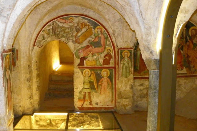 stilistiche e pittoriche che lo contraddistinguono: siamo tra IX e X secolo, appena al di fuori delle mura del castrum (oggi sito Unesco nella rete “Longobardi in Italia: i luoghi del potere 568-774 d.C.) in quello che sembrerebbe essere un oratorio nobiliare voluto da una elite territoriale. Nell’affresco, Maria è sdraiata su un giaciglio bianco in un paesaggio agreste, mentre sullo sfondo compaiono le mura di Betlemme. Una levatrice si avvicina alla Madonna e tende il braccio per poterla visitare, mentre il bambino è già nato e lo spazio immerso nella luce. Una seconda levatrice lava il piccolo Gesù versando acqua da una brocca. Il braccio della levatrice si bloccherà, risanato solo in un secondo tempo dal volere di Dio, di fronte alla mancanza di fede nella Vergine del Signore.