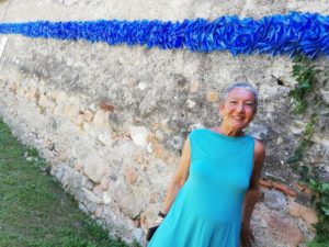 L’opera è composta da 3500 bottiglie di plastica blu, tagliate a formare altrettante farfalle, che montate assieme vanno a comporre una linea di orizzonte alta 25 cm e lunga 35 metri, come tutto il muro della location.