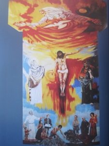 La prima opera, di grandi dimensioni articolata in tre parti fu “La Trinità” (1978) dipinta sulla parete dell’abside quale rappresentazione del Padre Eterno e dello Spirito Santo tesi ad abbracciare simbolicamente il Cristo Crocifisso.