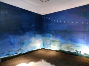 Proseguendo quindi un percorso di ricerca che ha caratterizzato la pittura degli ultimi due secoli, negli spazi della galleria Punto sull’Arte Gastaldo ha realizzato un’installazione che è viva: due pareti sono invase dal sovrapporsi delle sfumature del blu intenso del cielo – realizzato a partire dal bitume, poi mescolato con l’olio e schiarito per sottrazione. A fare da cornice alla forza della Natura l’Uomo con il profilo della sua quotidianità: case, piccole luci.