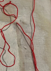 Cucire i giorni è invece una minuziosa installazione di pittura e arte tessile, composta da due elementi: un dipinto su stoffa, appeso alla parete, e un libro d’artista. Tutti i materiali impiegati sono materiali minimi, di scarto. La tela, un lenzuolo tessuto a mano, è una sorta di calendario/diario suddiviso in 64 riquadri, dipinti e ricamati uno ad uno per corrispondere ad altrettanti giorni di pittura e ricamo. Ciascun riquadro è lavorato con grafite, pittura a olio, collage e ricamo di cotone, e testimonia l’opera di stratificazione in cui l’artista ogni giorno ha dipinto e poi cancellato, lasciando agli occhi di chi guarda solo l’essenziale: un’ombra e una traccia della figurazione sottostante. L’apposizione del “punto lento” con il filo di cotone, bianco o rosso, richiama il tema del tempo e l’opera di cucitura e di ricucitura dei frammenti e degli strappi del presente. A corredo dell’“arazzo”, il libro d’artista riporta, giorno per giorno, i bozzetti realizzati e poi cancellati, corrispondenti ai giorni del calendario.