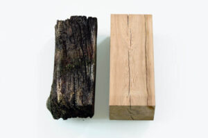 Al centro dello spazio, l’opera chance & change è composta da due parallelepipedi di legno che, nonostante le medesime dimensioni e materiali, mostrano stati vitali differenti: un primo solido appare perfettamente squadrato, chiaro e netto nel suo volume, nel colore, nella compattezza lignea; il secondo reca segni di decomposizione per effetto del tempo e di differenti cause di consunzione (il fuoco, l’acqua). I processi di cambiamento e transitorietà agiscono sulle cose trasformandone aspetto e struttura, rivelando la vitalità di ogni elemento, la sua incessante trasformazione all’interno del ciclo naturale.