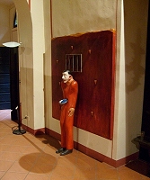 Insieme alle piccole sculture lignee una serie di disegni: uomini colorati ritratti nelle posizioni più svariate. L'allestimento è appropriato, consente la fruibilità di tutte le opere attenuando un po' il senso di spaesamento e d'angoscia. "Forse un po' inquietante" dice l'artista.