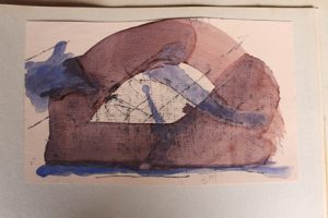 In altre carte dominano forme dai rimandi archeologici, fossili che paiono scavare la superficie piana sino a definire frammentate circolarità su sfondi inquieti solcati da lievi incisioni e da pieghe pronte ad aprirsi sotto l’influenza di ataviche evocazioni.