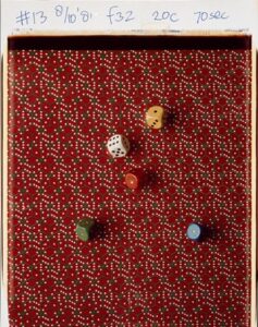 Sulle facciate multicolori di alcuni dadi da gioco, posati su un panno rosso compaiono numeri che rimandano alla casualità della sorte.