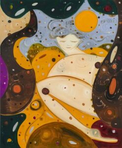 La quotidianità ritorna negli scenari creati da Yulia Losilzon (1992, nata in Israele, vive e lavora a Londra) in essi si relazionano figure magiche e fiabesche che rimandano alle illustrazioni per l’infanzia, tanto da animare momenti ironici e grotteschi.