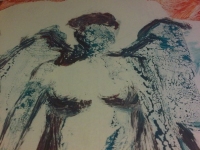 Un angelo di DellantonioPensiero dell'artista – "Quando gli angeli chiamano, ci avvertono, volano, parlano con voci sottili. Proprio in un aeroporto il volo è padrone. Ma io qui, esattamente, cosa ci sto a fare? E chi sono queste belle persone??? la farmacista, la ragazza degli orologi, la barista l'hostess elegante? Sono Angiolette nel loro mondo, ed allora propongo a voi tutti i miei angeli quotidiani, assopiti, nudini ma vestiti di colore, amici di puttini curiosi, con frecce scagliate sottili, capelli fini, svolazzanti. E poi su tutte un'angioletta Laura che dalla città della grande mela mi sorregge e stimola. Allora?? Buon viaggio quadri siete piccoli e teneri, andate bene per la Farmagallery, cari amici adottateli, gustateveli, venite a volare nei colori nelle belle forme. Insieme. Lasciamo entrare la pace. Gli ANGELI. Il loro ritorno".
