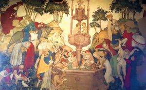Sulla parete sud troviamo il mito dell’Eterna Giovinezza, ispirato a un romanzo dell’antica tradizione francese medievale, il “Roman de Fauvel”. Una processione disordinata e vivace di personaggi di vario rango e età accorrono verso una fontana esagonale rappresentata al centro della parete: qui ognuno di loro si immerge per uscirne giovane e rigenerato, con la promessa dell’eternità.